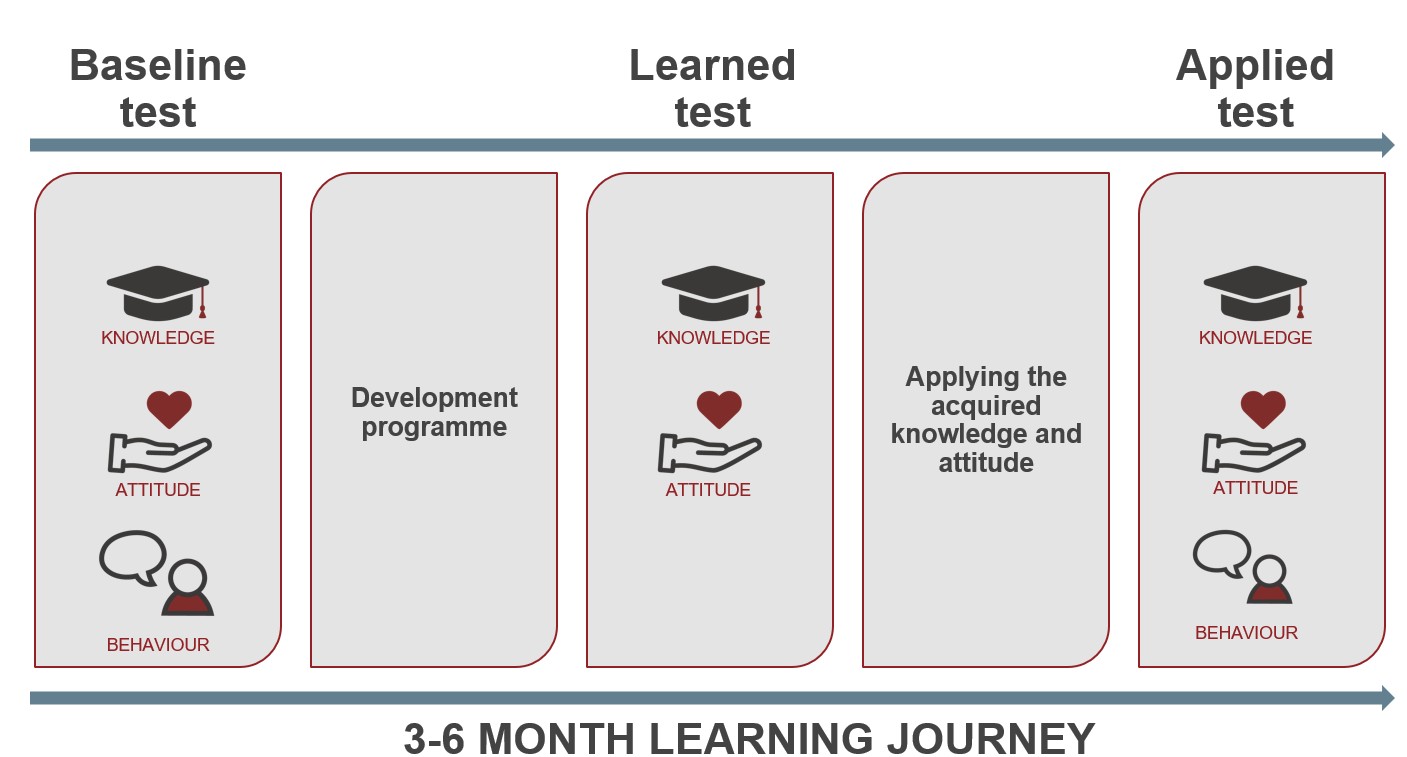 The analysis shows us how much knowledge and changes the participants have adopted and how many changes have really stuck after a few months of the program. Changes in individuals are measured in knowledge, attitude and behavior.